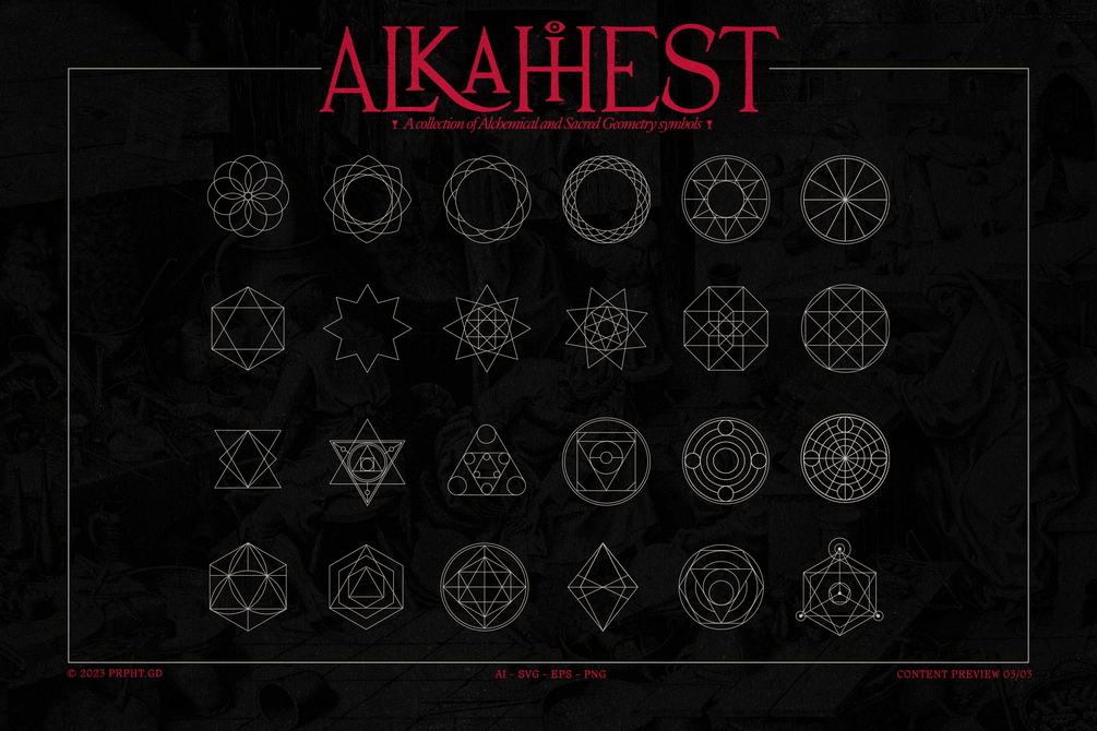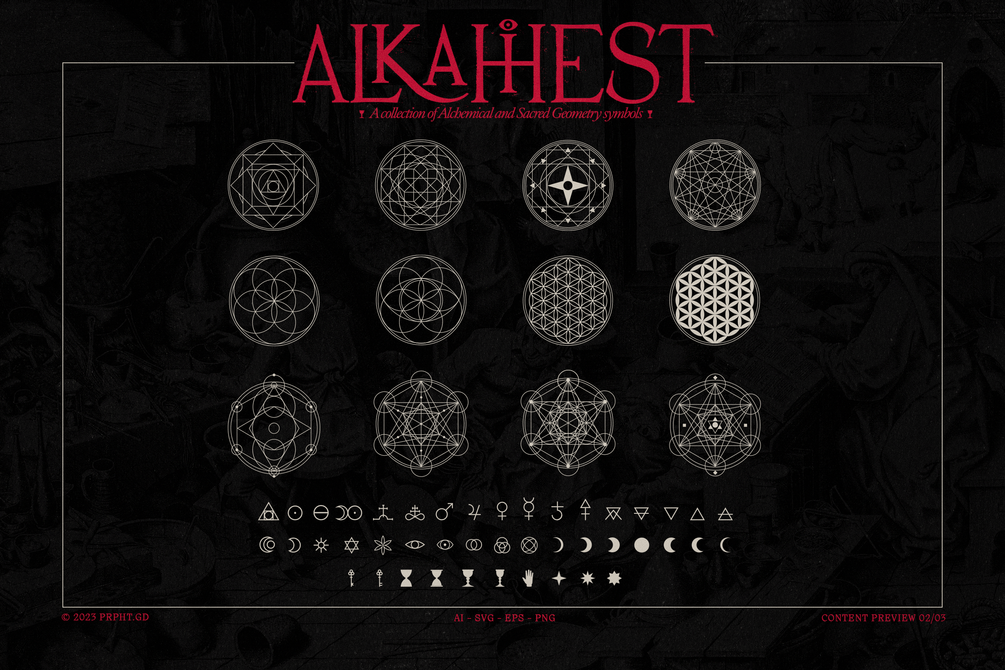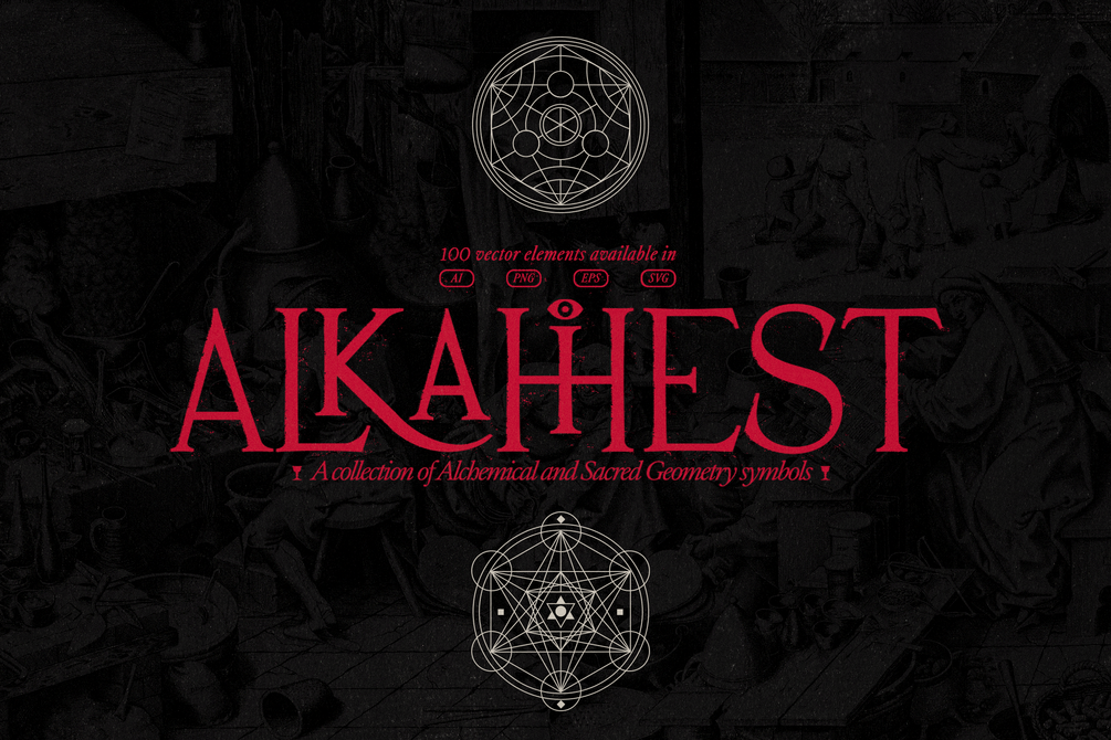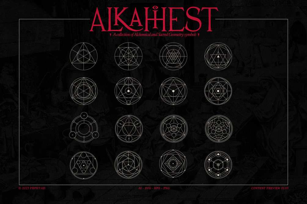 Alkahest is the ultimate vector pack for anyone looking for alchemical or sacred geometry shapes for your occult looking designs!